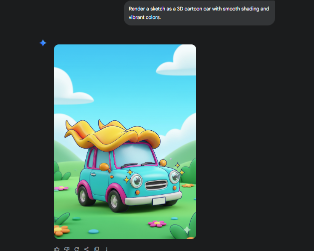 Prompt: Render a sketch as a 3D cartoon car with smooth shading and vibrant colors.