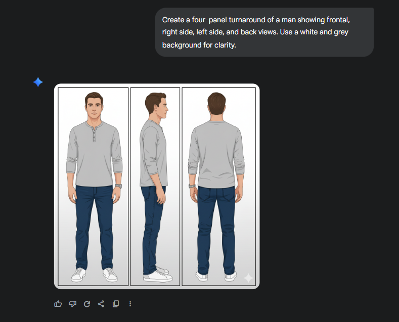You can start with a base character and use a Nano Banana model prompt to generate poses, turnarounds, or even full sprite sheets in one go.