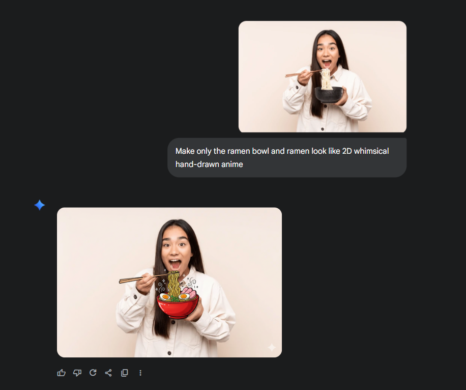 Prompt: “Make only the ramen bowl and ramen look like 2D whimsical hand-drawn anime.”