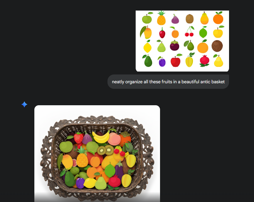 Example: “I uploaded several fruit photos into one image and prompted Nano Banana to neatly arrange all the fruits in an archaic woven basket.”