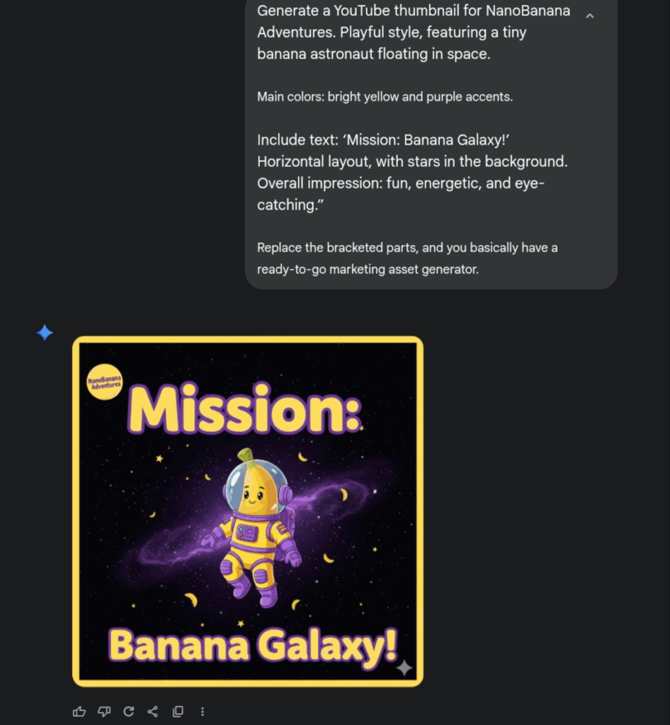 Example: “Generate a YouTube thumbnail for NanoBanana Adventures. Playful style, featuring a tiny banana astronaut floating in space.