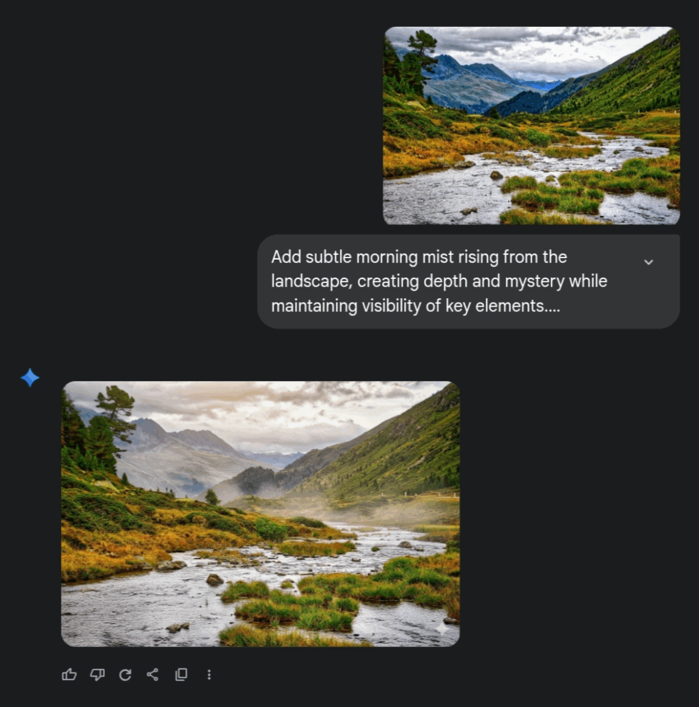 Example: A mountain valley photo now feels mystical, with soft morning haze and a cinematic vibe.