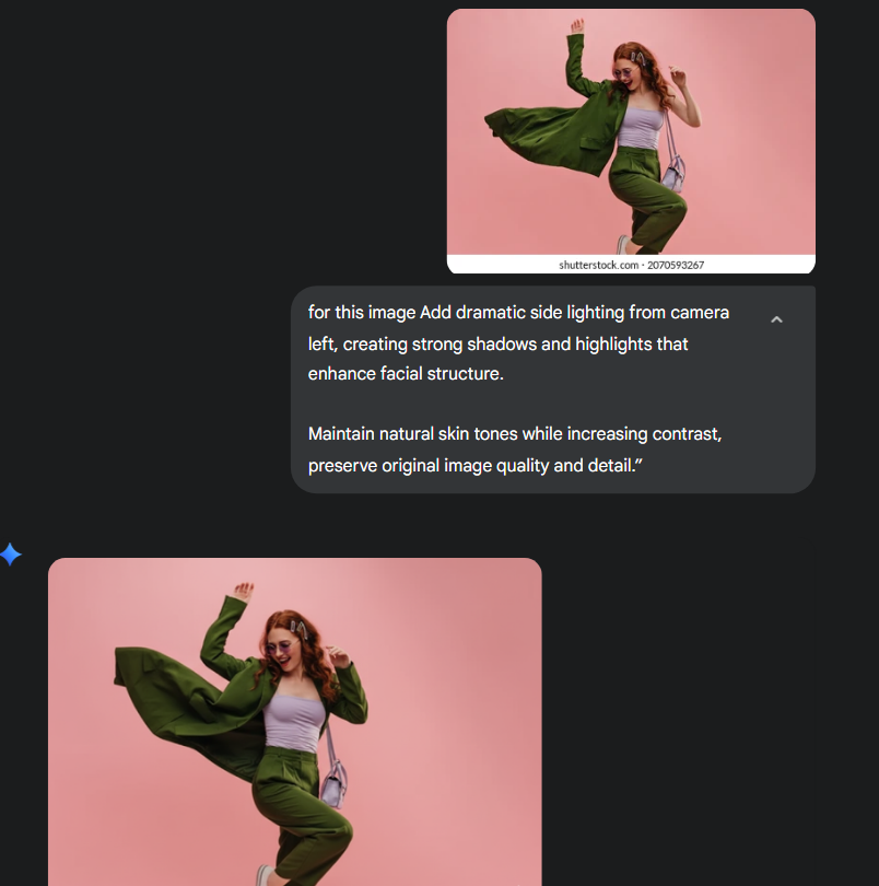 Prompt: “Add dramatic side lighting from camera left, creating strong shadows and highlights that enhance facial structure.